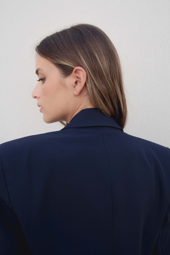 Blazer azul marino de corte estructurado y elegante, diseñado para aportar sofisticación a cualquier look. Su diseño cruzado con botones dorados y solapas definidas lo convierten en una prenda atemporal, perfecta tanto para ocasiones formales como para estilismos modernos de diario.